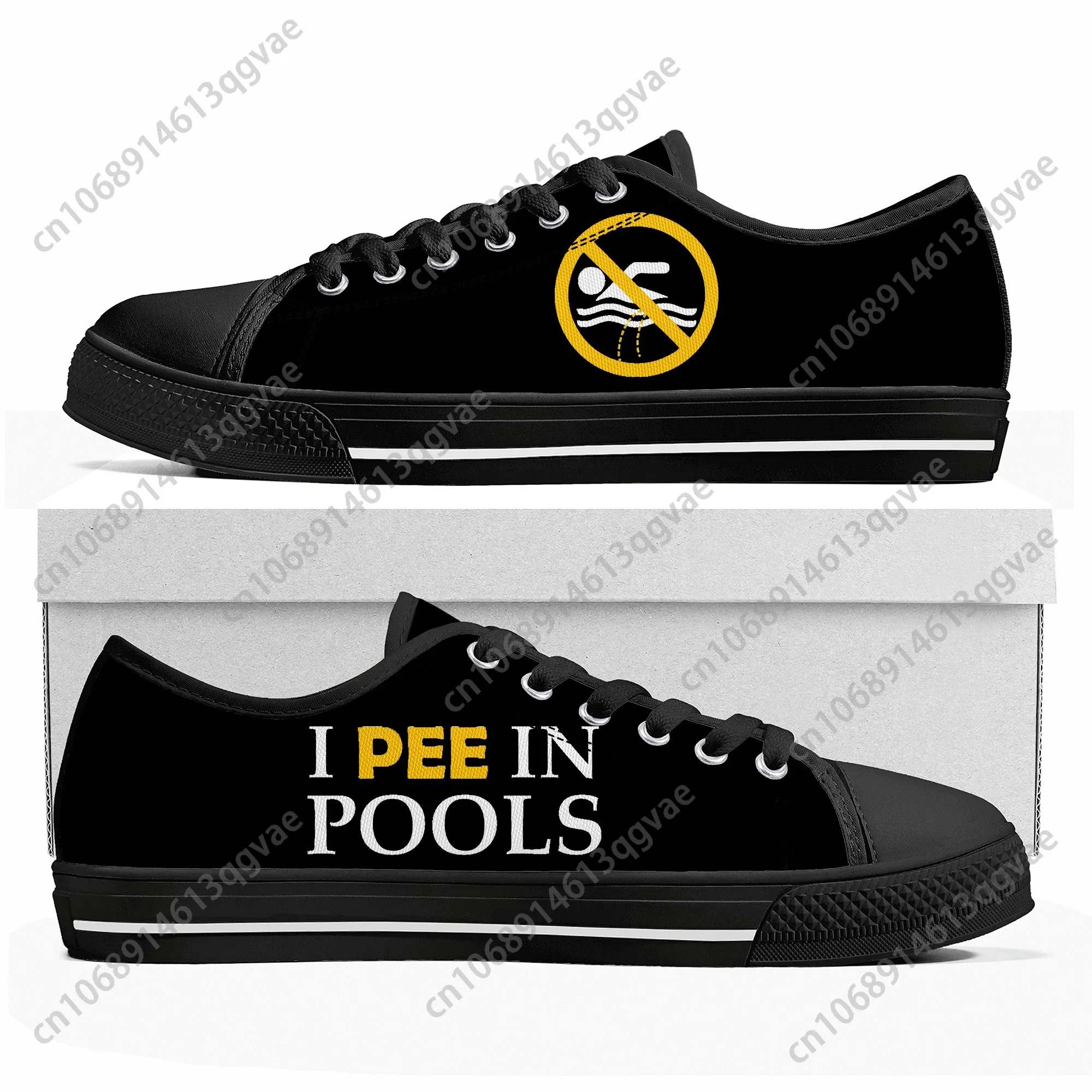 “I Pee in Pools” No Peeing Sign Funny Black Canvas Low Top Sneakers Casual Unisex Shoes cn1068914613qgvae